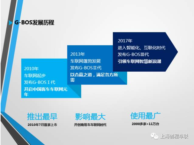 經(jīng)歷了公司成立之初的艱辛砥礪后,上海創(chuàng)程于2013年5月22日在北京上市發(fā)布G-BOS智慧運營系統(tǒng)II代,與其他類似產(chǎn)品一個顯著不同之處是實現(xiàn)了“三合規(guī)”:一是通過了公安部CCC檢測認證、交通運輸部部標認證;二是GPS/北斗雙模終端率先通過交通運輸部部標認證,成為客車行業(yè)首家;三是率先通過交通運輸部平臺符合性檢測,這也是客車行業(yè)首家。G-BOS智慧運營系統(tǒng)II代獨創(chuàng)性地提出了“帶機入網(wǎng)”的業(yè)務模式,啟動深藍計劃,與國內(nèi)各地的GPS運營商建立并展開廣泛合作,著力于解決G-BOS的落地接入問題,為G-BOS的商業(yè)運營奠定了堅實的基礎。