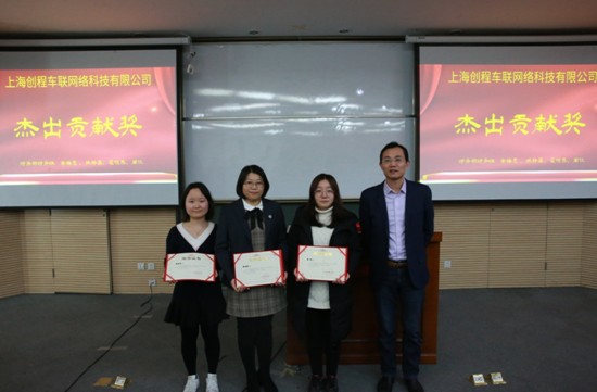 杰出貢獻(xiàn)獎(從左到右翟曉燕、黃梅霞、周悅、張靜晶(未到)、邱總(頒獎人員))