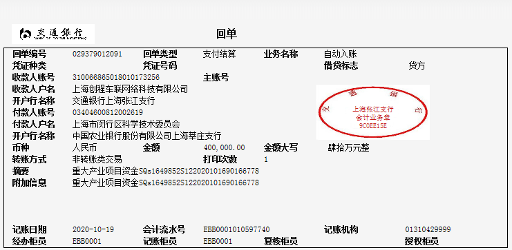 2020年8月,根據(jù)《閔行區(qū)關于推進科技創(chuàng)新創(chuàng)業(yè)和成果轉(zhuǎn)化的政策意見》(閔府規(guī)發(fā)〔2019〕1號)及操作細則,上海創(chuàng)程“基于5G技術的智能網(wǎng)聯(lián)公交系統(tǒng)”項目立項獲得成功,10月份,我司該項目已通過上海市閔行區(qū)科學技術委員會的驗收,并獲得50%項目經(jīng)費,共40萬元,另一半項目經(jīng)費預計明年撥付。