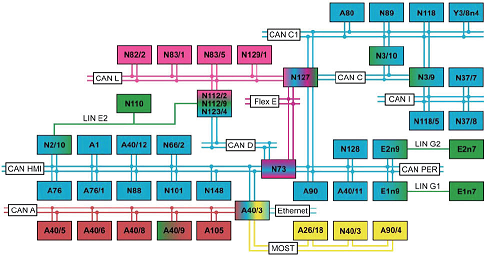 CAN A。車載智能信息系統(tǒng) (CAN);CAN C. 發(fā)動機控制器區(qū)域網(wǎng)絡 (CAN);CAN C1. 傳動系統(tǒng)控制器區(qū)域網(wǎng)絡 (CAN);CAN D. 診斷控制器區(qū)域網(wǎng)絡(CAN);CAN HMI. 用戶界面控制器區(qū)域網(wǎng)絡 (CAN);CAN I. 傳動系傳感器控制器區(qū)域網(wǎng)絡 (CAN);CAN L. 混合動力控制器區(qū)域網(wǎng)絡 (CAN);CAN PER. 外圍設備控制器區(qū)域網(wǎng)絡 (CAN);Ethernet. 以太網(wǎng);Flex E. 底盤 FlexRay;LIN E2. 座椅承載識別區(qū)域互聯(lián)網(wǎng) (LIN);LIN G1. 左側(cè)大燈局域互聯(lián)網(wǎng) (LIN);G2. 右側(cè)大燈局域互聯(lián)網(wǎng) (LIN);MOST. 多媒體傳輸系統(tǒng)。2. 車際網(wǎng)絡