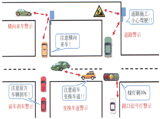 DSRC是基于美國電氣電子工程師協(xié)會(IEEE),在IEEE802.11 的Wi-Fi技術(shù)基礎上改進制定的IEEE802.11p標準和IEEE1609標準的V2V和V2I通信協(xié)議,是比較成熟、高效的無線通信系統(tǒng)技術(shù),它是智能交通系統(tǒng)的重要基礎之一,目前已被歐洲、日本等國汽車制造企業(yè)采用并完善。我國在高速公不停車收費設備(ETC)也采用該項技術(shù)。DSRC通信在5.9GHz附近的頻段上,專門將車與車、車與道路基礎設施有機連接,實現(xiàn)在數(shù)百米的范圍內(nèi)對高速行駛的車輛進行識別和雙向通信,提供實時圖像、語音和數(shù)據(jù)信息傳輸,保證通信鏈路的低時延和低干擾以及系統(tǒng)的可靠性。例如DSRC在有效通信距離范圍內(nèi),本車輛通過DSRC以10Hz的頻率,向路上其他車輛發(fā)送位置、車速、方向等信息;同時本車輛還能收到其他車輛所發(fā)出的信號,在必要時(例如馬路轉(zhuǎn)角有車輛駛出,或前方車輛突然緊急剎車,變換車道的情況發(fā)生)車內(nèi)信號裝置會以閃爍、語音提醒或座椅、方向盤振動等方式提醒駕駛員注意,采取必要安全措施,如圖9所示。