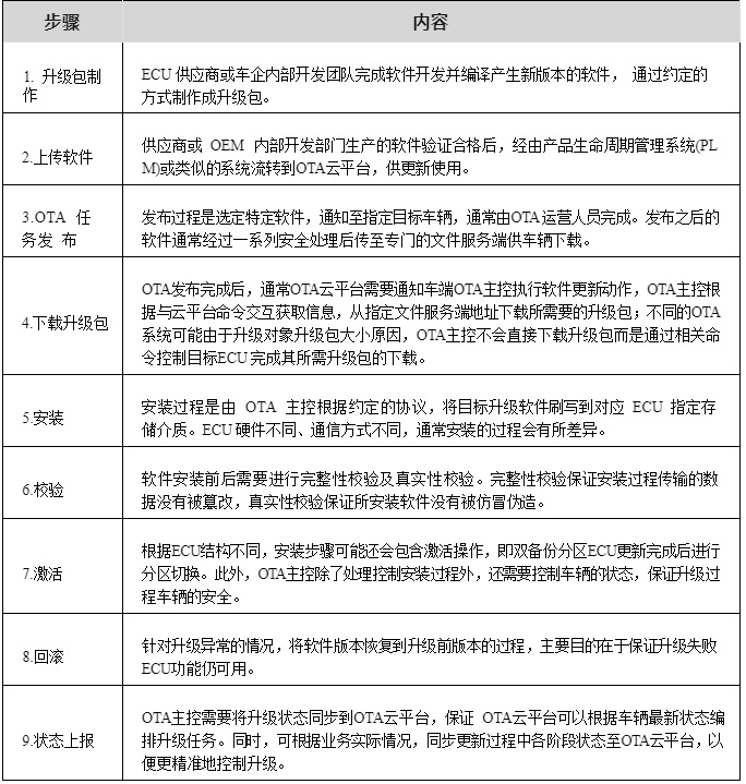圖2-1 是一個典型的 OTA 系統(tǒng)框架,包含了三個基本要素,即云端的 OTA 平臺、車端 OTA 主控、OTA 對象。其中:OTA 云平臺負責 OTA 升級包管理、車輛管理及 OTA 發(fā)布等功能,車端 OTA 主控負責從 OTA 云平臺下載升級包并將其刷寫到目標 ECU ,OTA 升級對象即最終軟件刷寫的主體,從主控接收軟件并完成自身軟件更新。OTA 的基本實現(xiàn)流程(圖2-1)可歸納為下表 2-3 所示步驟。