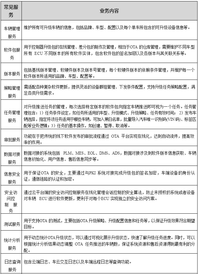 (4)業(yè)務(wù)服務(wù)層:業(yè)務(wù)服務(wù)層是 OTA 服務(wù)所有業(yè)務(wù)及相關(guān)流程管理功能在云平臺(tái)端的實(shí)現(xiàn), 除了車輛管理服務(wù)、軟件包服務(wù)、版本服務(wù)、策略管理和任務(wù)管理 5 個(gè)支撐 OTA 的核心功能外,還包括關(guān)聯(lián)系統(tǒng)審批、數(shù)據(jù)對(duì)接、信息安全服務(wù)、測(cè)試、統(tǒng)計(jì)分析、日志查詢等重要輔助功能。由于不同的企業(yè)內(nèi)部管理存在差異,云平臺(tái)所支持的輔助業(yè)務(wù)可能存在較大差異,常見服務(wù)列舉見表 2-4。