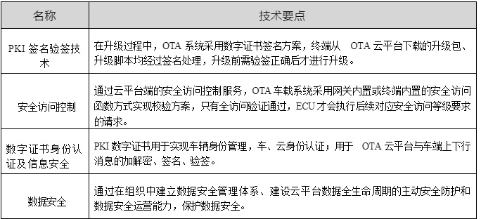 OTA 服務(wù)端以及企業(yè) IT 管理系統(tǒng)、安全服務(wù)端、web 控制臺(tái)、文件服務(wù)端 等關(guān)聯(lián)系統(tǒng),會(huì)面臨傳統(tǒng)云平臺(tái)的所有安全威脅。為保證 OTA 升級(jí)的安全性,常用安全技術(shù)如表 2-5 所示。