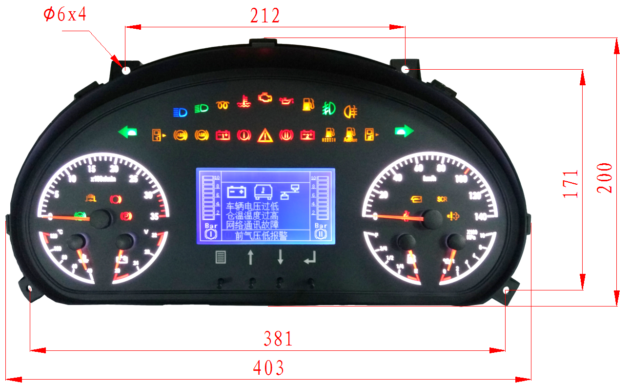 - 6個(gè)步進(jìn)電機(jī)驅(qū)動(dòng)的指針表盤(pán) - 30個(gè)LED符號(hào)片 - 多個(gè)TFT符號(hào)片 - 5寸TFT單色屏 - 一個(gè)多音頻蜂鳴器 |