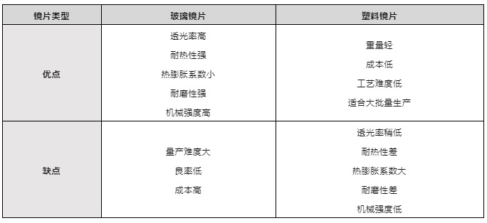 光學鏡頭通常由多片鏡片構(gòu)成,按鏡片的材質(zhì)可分為三種類型:塑膠鏡頭、玻塑混合鏡頭和玻璃鏡頭。由于車載鏡頭有高耐用性和高穩(wěn)定性等要求,故車載鏡頭通常會選用玻塑混合鏡頭或玻璃鏡頭。
