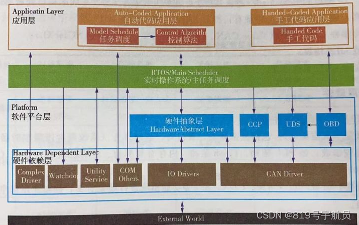 硬件依賴(lài)層(底層驅(qū)動(dòng)):包括復(fù)雜驅(qū)動(dòng)、看門(mén)狗、基礎(chǔ)服務(wù)(系統(tǒng)調(diào)度所需定時(shí)器、中斷管理和一些通用處理函數(shù),如PLL驅(qū)動(dòng)、Flash驅(qū)動(dòng)、內(nèi)存管理驅(qū)動(dòng)、定時(shí)器驅(qū)動(dòng))、IO、CAN等其他驅(qū)動(dòng)。